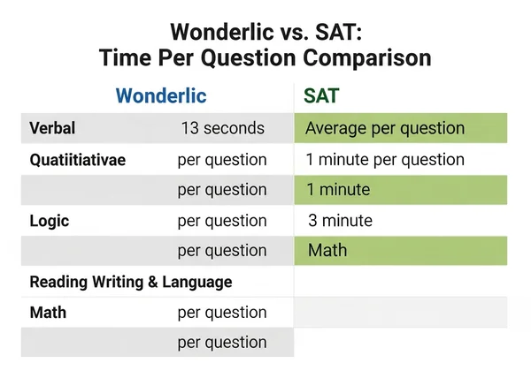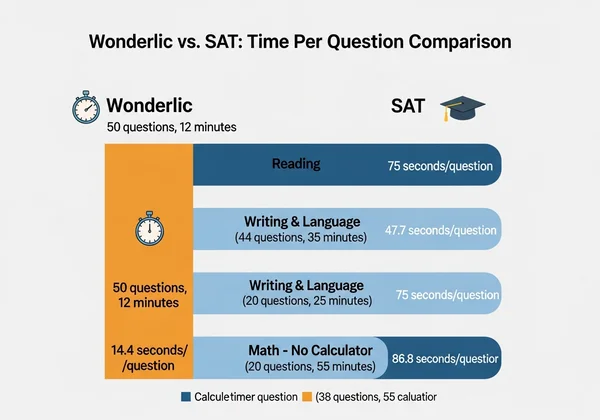 As you can see, you have about 1/5th of the time per question on the Wonderlic compared to the SAT. You cannot afford to second-guess yourself.